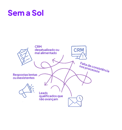 A Sol mantém o funil em ordem: move etapas no CRM conforme regras, enriquece registros, evita duplicidades e orquestra handoff para humanos pela nossa plataforma de mensagens. Você ganha operações consistentes e escaláveis, com visibilidade para otimizar o processo.